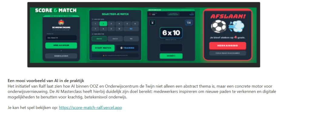 Tijdens de AI Masterclass van OOZ raakte docent Ralf Ulrich (r.ulrich@ooz.nl) van VSO de Twijn geïnspireerd door de mogelijkheden van kunstmatige intelligentie in het onderwijs. Zijn nieuwsgierige begin leidde uiteindelijk tot een concreet onderwijsproject: een educatief voetbalspel waarmee leerlingen rekensommen kunnen oefenen. Ondanks het ontbreken van programmeerervaring, gebruikte Ralf zijn standaard ICT-vaardigheden en de inspiratie uit de AI Masterclass om via AI-prompts een spel voor zijn klas te ontwikkelen.